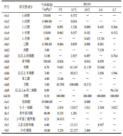利用相對(duì)氣味活度值(relativeodoractivityvalue,ROAV)評(píng)定各揮發(fā)性化合物對(duì)樣品總體氣味的貢獻(xiàn),定義對(duì)樣品風(fēng)味貢獻(xiàn)最大的組分:ROAVstan=100,則其他揮發(fā)性化合物的ROAV小于100,按下式計(jì)算: