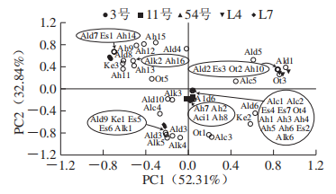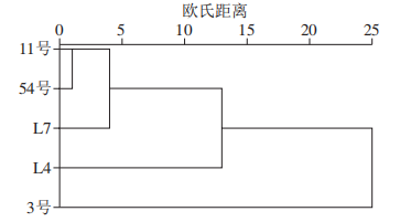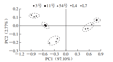 為了進(jìn)一步分析SPME-GC-MS對(duì)于不同品種金針菇揮發(fā)性風(fēng)味成分區(qū)分情況,將SPME-GC-MS數(shù)據(jù)進(jìn)行HCA,結(jié)果如圖2所示。從圖2可以看出,不同品種金針菇揮發(fā)性成分的聚類(lèi)樹(shù)狀圖顯示出3個(gè)主要類(lèi)別。其中,11號(hào)、54號(hào)和L7的樣品被歸為一類(lèi),而L4和3號(hào)的樣本被分別歸為其余兩類(lèi)。在第一大類(lèi)中,11號(hào)和54號(hào)的樣品在最小距離水平上首先聚類(lèi),這說(shuō)明二者的樣品揮發(fā)性成分相似度很高。隨著歐式距離的增加,L7的樣品也并入到這一類(lèi)中。而當(dāng)歐式距離增加至13時(shí),L4與11號(hào),54號(hào)和L7的樣品歸為一類(lèi)。隨著歐式距離的繼續(xù)增大,當(dāng)增至25時(shí),三大類(lèi)才歸為一類(lèi)。這與2.1.2節(jié)結(jié)果一致。HCA差異主要由不同品種中各類(lèi)化合物種類(lèi)和含量不同造成。結(jié)合表1可知,由于醇類(lèi)、醛類(lèi)和芳香烴類(lèi)物質(zhì)占所檢測(cè)總物質(zhì)的60%~95%,因此影響樣品聚類(lèi)的主要因素是三者的相對(duì)含量。