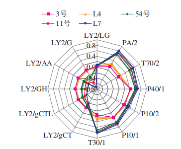 如表2所示,辛醛、苯乙醛、壬醛、癸醛、2-十一烷酮、2-甲基丁酸甲酯、D-檸檬烯為3號(hào)金針菇的特征揮發(fā)性物質(zhì)(ROAV≥1),香葉基丙酮對(duì)3號(hào)金針菇的整體風(fēng)味起修飾作用(0.1≤ROAV<1);1-己醇、反式-2-庚烯醛、辛醛、反式-2-辛烯醛、壬醛、2-十一烷酮、香葉基丙酮、2-正戊基呋喃、D-檸檬烯為11號(hào)金針菇的特征揮發(fā)性物質(zhì)(ROAV≥1),1-庚醇、1-辛醇對(duì)11號(hào)金針菇的整體風(fēng)味起修飾作用(0.1≤ROAV<1);1-壬醇、辛醛、壬醛、癸醛、2-十一烷酮、D-檸檬烯為54號(hào)金針菇的特征揮發(fā)性物質(zhì)(ROAV≥1),1-辛醇、反式-2-庚烯醛對(duì)54號(hào)金針菇的整體風(fēng)味起修飾作用(0.1≤ROAV<1);1-壬醇、庚醛、辛醛、反式-2-辛烯醛、癸醛、2-十一烷酮、2-正戊基呋喃為L(zhǎng)4金針菇的特征揮發(fā)性物質(zhì)(ROAV≥1),1-己醇對(duì)L4金針菇的整體風(fēng)味起修飾作用(0.1≤ROAV<1);反式-2-辛烯醛、反,反-2,4-癸二烯醛、癸醛、2-十一烷酮為L(zhǎng)7金針菇的特征揮發(fā)性物質(zhì)(ROAV≥1),1-己醇、1-辛醇、反式-2-庚烯醛對(duì)L7金針菇的整體風(fēng)味起修飾作用(0.1≤ROAV<1)。