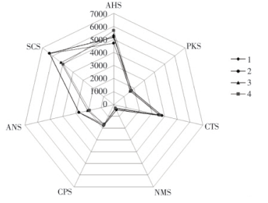 由圖4可知,電子舌的7個傳感器對不同菌菇類魚松樣品均能做出不同程度的響應(yīng)。其中傳感器SCS和AHS的響應(yīng)信號最強,傳感器NMS的響應(yīng)信號最弱。各菌菇魚松的傳感器SCS、ANS和AHS的響應(yīng)信號有明顯的差異,而傳感器CPS、NMS、CTS和PKS的響應(yīng)值差異不明顯。
