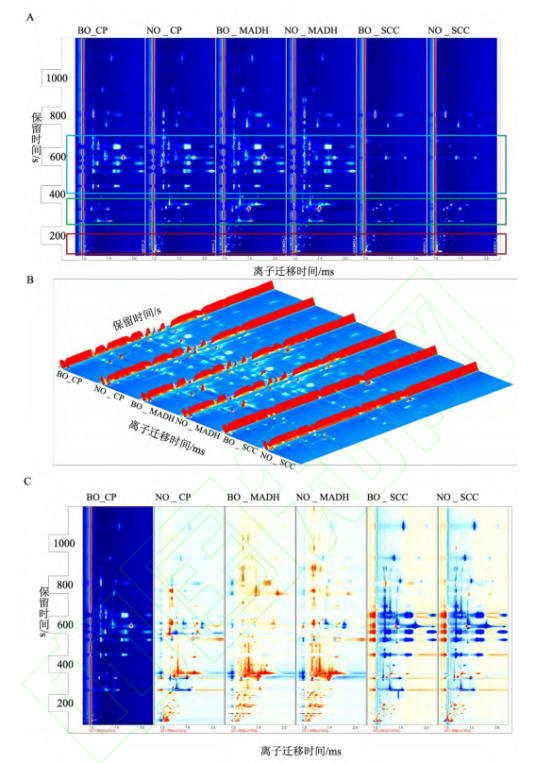 圖2 六種甜橙精油的揮發(fā)性物質(zhì)GC-IMS二維(A)、三維(B)和二維差異譜圖(C)