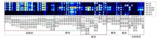 為了更直觀展現(xiàn)樣品間差異,將血橙冷壓精油譜圖作為參比,其余五個(gè)樣品譜圖均扣減參比,紅色表示此樣品中該化合物濃度高于參比譜圖,藍(lán)色表示該化合物濃度低于參比譜圖。根據(jù)圖2C可以看出,不同品種和提取方式對(duì)甜橙揮發(fā)性成分均有影響。MADH精油的譜圖多個(gè)峰顯現(xiàn)紅色,說(shuō)明該方式提取的精油相比于CP含有更豐富的揮發(fā)性物質(zhì);SCC萃取液的譜圖則顯現(xiàn)大面積藍(lán)色,說(shuō)明香氣化合物含量極低,這和感官結(jié)果一致。此外,血橙精油和臍橙精油相比也有一定差異。