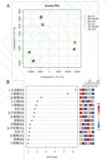 為了篩選六種精油的差異揮發(fā)性化合物,基于GC-IMS檢測(cè)到的64個(gè)物質(zhì)的峰信號(hào)強(qiáng)度進(jìn)行偏最小二乘法判別分析(PLS-DA)。如圖4A所示,PC1和PC2的貢獻(xiàn)率分別為74.1%和10.7%,累計(jì)貢獻(xiàn)率為84.8%,表明該模型能夠充分反映樣品原始信息。每一聚類中的3個(gè)點(diǎn)緊密聚集在一起,說(shuō)明組間重復(fù)性好,GC-IMS檢測(cè)性能穩(wěn)定??梢钥闯隽N樣品有明顯的區(qū)分,NO_CP和NO_MADH均分布在上方區(qū)域,兩者差異較?。籅O_CP和BO_MADH均分布在左下方,兩者也較為相似;BO_SCC和NO_SCC均分布在右側(cè)區(qū)域,同樣具有一定相似性。對(duì)于同一種甜橙,CP和MADH兩種方式提取的精油距離相近,但和SCC萃取液相距較遠(yuǎn),說(shuō)明前兩種方式和后者提取的揮發(fā)性成分差異較大。此外,同一種方式提取的兩種甜橙精油,如BO_CP和NO_CP,BO_MADH和NO_MADH,揮發(fā)性成分也具有較大差異。