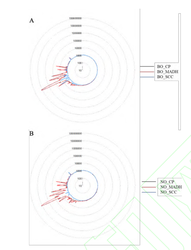 圖5 基于電子鼻分析的甜橙精油雷達(dá)指紋圖譜:(A)血橙(B)臍橙