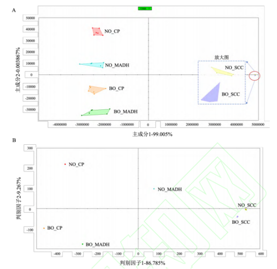 圖6 基于電子鼻分析的六種甜橙精油PCA(A)和DFA(B)分類結(jié)果