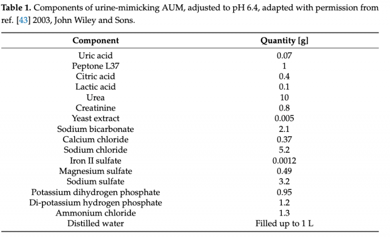 科普:人工尿液培養(yǎng)基(AUM)是一種模擬人體尿液環(huán)境的培養(yǎng)基,用于檢測和分析細菌生長。AUM中包含尿液中的一些重要成分,如尿素、氨、肽酶等,這些成分可以作為細菌生長的來源。文中的AUM配方如下: