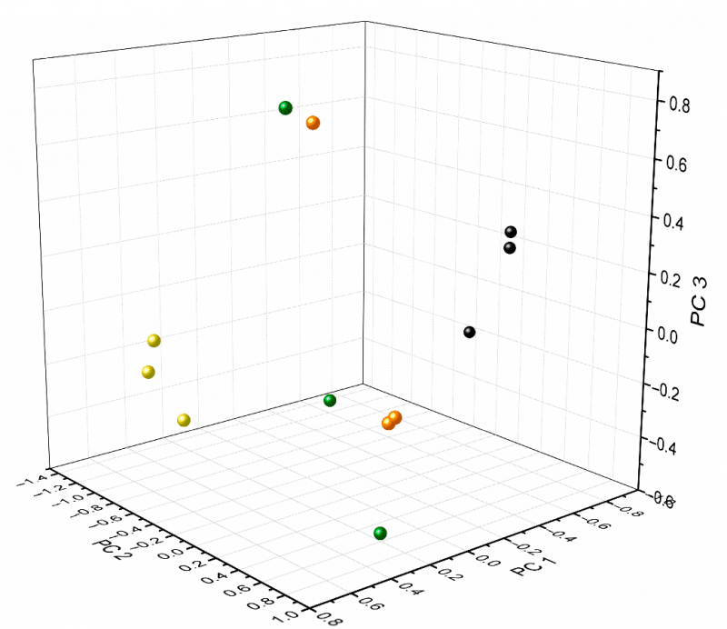 電子舌的主成分分析(PCA)結(jié)果表明,受感染的樣本可與 AUM 區(qū)分開來,而肺炎雙球菌可與其他物種區(qū)分開來。見下圖,黑色點是單純AUM,黃色點是肺炎雙球菌感染的AUM,綠色點是糞腸球菌感染的AUM,橙色是大腸桿菌感染的AUM。