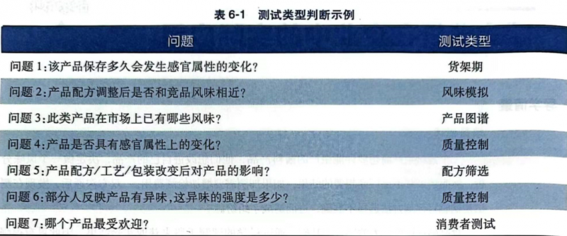 當(dāng)企業(yè)在新產(chǎn)品開(kāi)發(fā)環(huán)節(jié)中運(yùn)用到感官評(píng)價(jià)時(shí),研發(fā)人員以及營(yíng)銷(xiāo)人員會(huì)針對(duì)感官分析師提出很多問(wèn)題。在企業(yè)運(yùn)用中,我們根據(jù)目的可以將感官評(píng)價(jià)分為以下幾類(lèi):貨架期、配方篩選、產(chǎn)品圖譜、質(zhì)量控制、風(fēng)味模擬、消費(fèi)者測(cè)試,見(jiàn)表6-1。