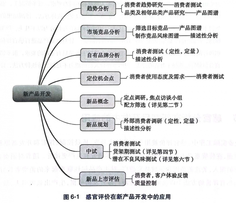 完整的新品開(kāi)發(fā)流程具有很多環(huán)節(jié),其中包含產(chǎn)品趨勢(shì)分析,自有品牌分析,新品概念的生成,產(chǎn)品線規(guī)劃,中試以及新品上市放行等。因此,在新品開(kāi)發(fā)中感官評(píng)價(jià)的方法是綜合性的,即多個(gè)感官測(cè)試貫穿于整個(gè)新品開(kāi)發(fā)流程中。常見(jiàn)方法分布見(jiàn)圖6-1。