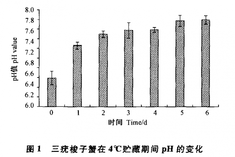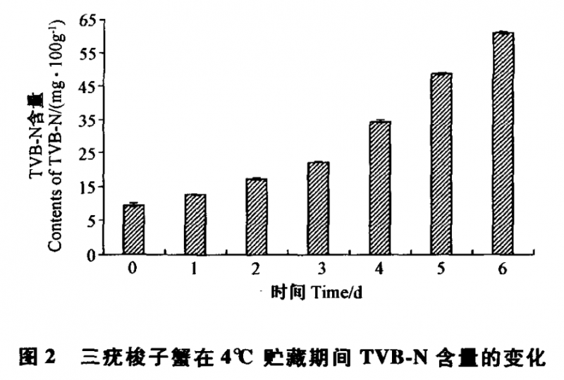 由圖 2可知,TVB-N 含量在貯藏初期變化緩慢,這是由于低溫 (4℃)和真空包裝條 件抑制了蟹肉中微生物的生長(zhǎng)和繁殖,導(dǎo)致貯藏前期TVB-N含量增長(zhǎng)緩慢 。從貯 藏第 4天開(kāi)始TVB-N含量顯著上升,含量由34.44mg·100g-1 上升到貯藏第 6 天 的 60.76mg·l00g-1。GB2733—2005 規(guī)定新鮮海蟹的TVB-N含量值應(yīng)低于 25mg·100g-1,貯藏第 3天蟹肉的TVB-N含量為 22.26mg·100g-1,仍屬于新鮮蟹 肉,貯藏第 4天蟹肉的TVB-N含量高于規(guī)定標(biāo)準(zhǔn),已腐敗變質(zhì),由此表明 TVB-N 可 以反映蟹肉鮮度的變化 。