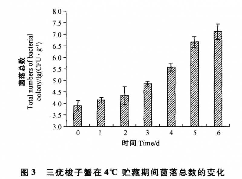 由圖 3可知,貯藏初期菌落總數(shù)較少且變化緩慢,隨貯藏時(shí)間的延長(zhǎng),菌落總數(shù)顯 著增長(zhǎng) (P<0.01)。新鮮蟹肉菌落總數(shù)為 3.89lg(CFU·g-1 ),貯藏第3天蟹肉的菌落總數(shù)為 4.84lg(CFU·g-1 ),約為新鮮蟹肉菌落總數(shù)的 10 倍,貯藏第 6天菌落總 數(shù)為 7.11lg(CFU·g-1),約是新鮮蟹肉的 1000 倍,說(shuō)明貯藏后期蟹肉的營(yíng)養(yǎng)結(jié)構(gòu) 和環(huán)境條件逐漸適宜細(xì)菌的生長(zhǎng)繁殖,細(xì)菌菌落總數(shù)顯著增多,是導(dǎo)致蟹肉鮮度下降的主要原因。貯藏第 3天是蟹肉微生物菌落總數(shù)的變化節(jié)點(diǎn),與 TVB-N含量的變化節(jié)點(diǎn)相同且細(xì)菌菌落總數(shù)與 TVB—N含量變化趨勢(shì)相一致,說(shuō)明細(xì)菌菌落總數(shù)與TVB-N含量顯著相關(guān) 。