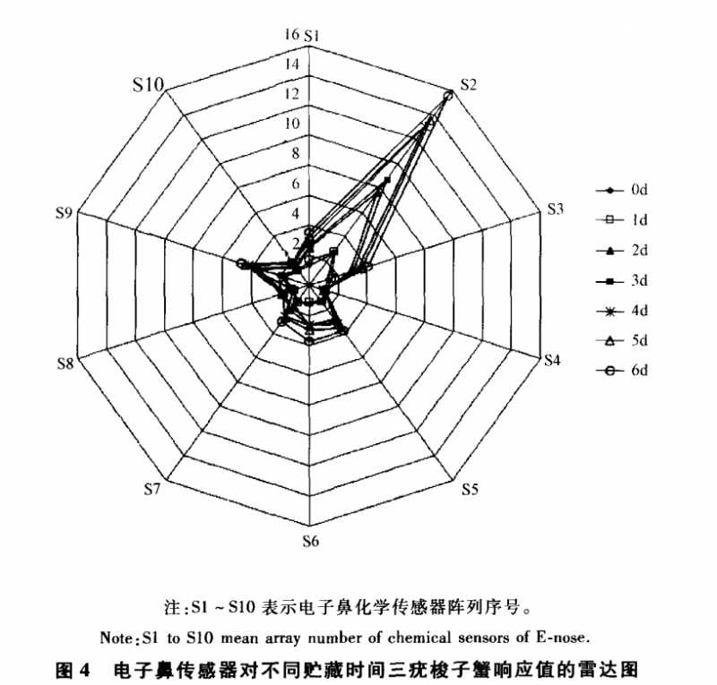 電子鼻傳感器陣列由10種金屬氧化物半導(dǎo)體型化學(xué)傳感元件組成,每型傳感元件所對(duì)應(yīng)的主要敏感物質(zhì)類(lèi)型有一定的區(qū)別:s1一芳香成分;s2一氮氧化合物;s3一氨氣;S4一氫氣;s5一烷烴芳香成分;s6一甲烷;s7一硫化物;S8一乙醇;s9一有機(jī)硫化物;S10一長(zhǎng)鏈烷烴。由圖 4可知,s2、s3、s5、s9號(hào)傳感器的響應(yīng)值較高 ,s4、s8、S10號(hào)傳感器響應(yīng)值較小,表明蟹肉在貯藏過(guò)程中主要產(chǎn)生氮氧化合物 、氨氣、烷烴類(lèi)芳香成分和含硫化合物等揮發(fā)性物質(zhì)。蟹肉中的含氮物質(zhì)和其它一些含硫蛋白質(zhì)在微生物和自溶酶的作用下分解產(chǎn)生大量的含氮化合物、氨氣和含硫化合物,使得蟹肉產(chǎn)不愉快的氣味。對(duì)傳感器的響應(yīng)值進(jìn)行組間差異性分析,表明 s1、s2、s3、S5、s6、s7、S9、SI0 號(hào)傳感器組間差異極顯著 (P<0.01),且 s2、s6、s9號(hào)傳感器的響應(yīng)值均隨貯藏時(shí)間的延長(zhǎng)不斷增大,s4、s8號(hào)傳感器組 問(wèn)差異不顯著 (P>0.05)。表明蟹肉貯藏過(guò)程中氮氧化合物、氨、烷烴芳香成分 、甲烷、硫化物、有機(jī)硫化物的氣味差異顯著,氫氣 、乙醇的氣味差異不顯著。