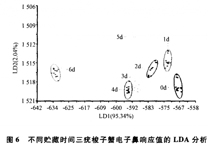 LDA能夠最大限度地區(qū)分不同的樣本集,在降低數(shù)據(jù)空間維數(shù)的同時(shí)最大限度地減少信息丟失。由圖 6可知,判別式 LDI的貢獻(xiàn)率是 95.34% ,判別式LD2的貢獻(xiàn)率 是 2.04% ,2個(gè)判別式的總貢獻(xiàn)率為97.38% ,大于 95% ,說(shuō)明第 1 和第 2 主成分構(gòu)成的二維平面足以表征不同冷藏時(shí)間下梭子蟹氣味的差異。此外,從右到左 依次是貯藏第 0、第 1、第 2、第 3、第 4、第 5、第 6天的梭子蟹氣味數(shù)據(jù),它們均能被很好地分開(kāi),說(shuō)明不同貯藏時(shí)間的梭子蟹的揮發(fā)性氣味成分存在顯著差異。與圖 5相比,圖 6中貯藏前期的點(diǎn)相對(duì)集中,隨著時(shí)間延長(zhǎng),點(diǎn)之間的距離增加,反映了蟹肉在貯 藏過(guò)程中產(chǎn)生的揮發(fā)性物質(zhì)濃度隨貯藏時(shí)間的延長(zhǎng)差異性越顯著 ,且揮發(fā)性物質(zhì)濃度與貯藏時(shí)間呈線性變化。這種差別可能是由 PCA 和 LDA 本身決定的,PCA適于分析以方差形式體現(xiàn)的數(shù)據(jù)分類(lèi)信息,而 LDA在數(shù)據(jù)輸入映射到坐標(biāo)軸時(shí),利用了數(shù)據(jù)內(nèi)部的分類(lèi)信息,使得類(lèi)別內(nèi)部的點(diǎn)更集中。