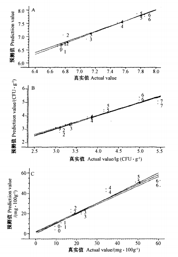 pH值、TVB-N 含量、細(xì)菌菌落總數(shù)建立預(yù)測(cè)模型的主因子數(shù)分別是 5、4、2。由圖 8可知,3個(gè)預(yù)測(cè)模型的校正決定系數(shù) R 均大于 0.900,預(yù)測(cè)決定系數(shù) R 均大于 0.870,表明電子鼻傳感器響應(yīng)值與 pH值、TVB-N含量、細(xì)菌菌落總數(shù)的相關(guān)性較好。經(jīng)統(tǒng)計(jì)學(xué)分析可知,pH 值的 RPD 值是 2.73,TVB-N 含量的RPD值是 2.50,細(xì)菌菌落總數(shù)的 RPD值是 3.06,說(shuō)明該預(yù)測(cè)模型對(duì)于細(xì)菌菌落總數(shù)的預(yù)測(cè)精度高,穩(wěn)定性好;pH值和 TVB-N的 RPD值在 2.5~3之間,說(shuō)明該預(yù)測(cè)模型是可行的,但預(yù)測(cè)精度需進(jìn)一步提高。