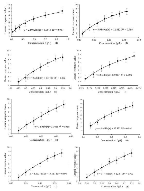4.1基于電子舌探究8種不同濃度梯度的單一鮮味物質(zhì)的響應(yīng)變化規(guī)律,得出不同濃度梯度鮮味物質(zhì)的響應(yīng)值隨濃度的增加而增加,且鮮味響應(yīng)值與濃度呈正相關(guān)的半對數(shù)關(guān)系,8種鮮味物質(zhì)的曲線形狀和方程相似但不同,表明基于電子舌8種鮮味物質(zhì)呈味特性相似但又各具特點(diǎn)。