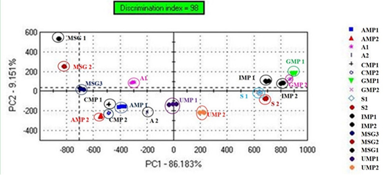 從圖2.2中可以看出,8種不同的鮮味劑能夠被很好的區(qū)分。PC1和PC2兩個主成分的貢獻(xiàn)率分別為86.18%、9.15%,累計(jì)方差貢獻(xiàn)率為95.33%。說明PC1和PC2包含了較大的樣品信息量,能很好的反應(yīng)樣品的信息,反應(yīng)了不同鮮味劑的差異。3次重復(fù)數(shù)據(jù)點(diǎn)可以清晰的聚成一個獨(dú)立的族群,說明PCA分析得到的實(shí)驗(yàn)數(shù)據(jù)的重復(fù)性很好。所有樣品組內(nèi)離散度小,組間距離較大,DI為98,區(qū)分度較高。每種鮮味劑的兩個濃度在PC2上按低濃度在上,高濃度在下的順序排列。