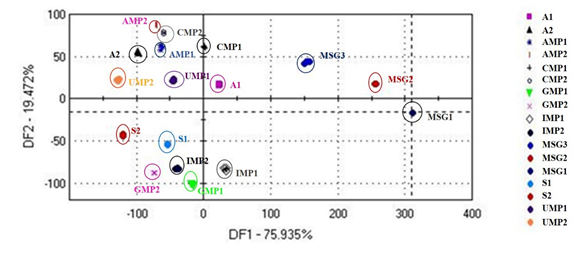 從圖2.3上可以看出,樣品的組內(nèi)離散度比PCA中的更小,組間空間距離變大,樣品完全分開,2個判別因子總貢獻(xiàn)率為95.41%,區(qū)分效果較好。沿DF1軸線方向MSG主要分布在右半部分,而其他樣品主要分布在左半部分;沿DF2軸線方向,AMP、A、CMP、UMP和MSG2、3主要分布在上半部分,S、IMP、GMP和MSG1則主要分布在下半部分。表明電子舌結(jié)合DFA法可用于食用菌的定性分析。綜合比較圖2.2和圖2.3,在對不同樣品的區(qū)分上DFA的區(qū)分效果優(yōu)于PCA。