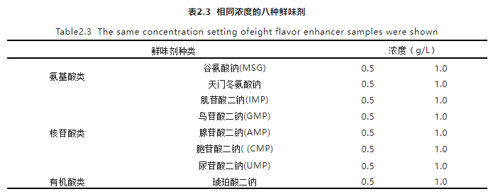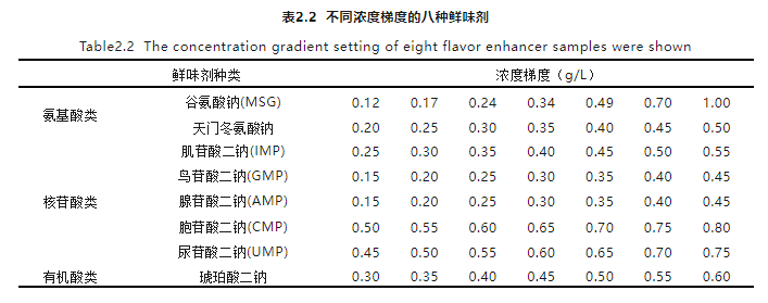 單一鮮味物質(zhì)濃度:按表2.2和2.3所列的濃度,準(zhǔn)確稱取不同量的谷氨酸鈉、天冬氨酸鈉、肌苷酸鈉、鳥苷酸鈉、腺苷酸鈉、胞苷酸鈉、鳥苷酸鈉和琥珀酸二鈉,溶液蒸餾水中攪拌溶解,待全部溶解后,轉(zhuǎn)移至100mL的容量瓶中,定容,配制成表中所示的濃度,備用。