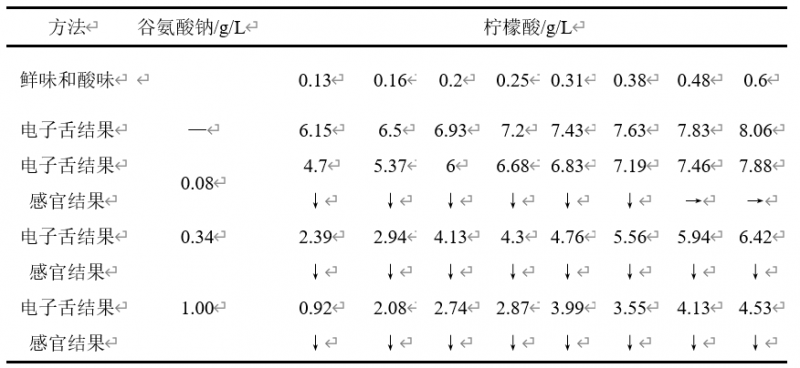 按表稱取一定量的酸與不同濃度的鮮味物質(zhì)相互混合配成100mL的溶液,待用。通過電子舌和感官評價(jià)兩種方法對鮮味和酸味的二元相互作用結(jié)果進(jìn)行分析,結(jié)果見表2.4。