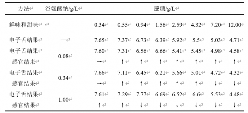 按表稱取一定量的甜味物質(zhì)與不同濃度的鮮味物質(zhì)相互混合配成100mL的溶液,待用。通過電子舌和感官評價(jià)兩種方法對鮮味和甜味的二元相互作用結(jié)果進(jìn)行分析,結(jié)果見表2.5。