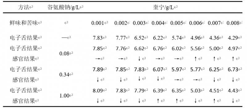 按表稱取一定量的苦味物質(zhì)與不同濃度的鮮味物質(zhì)相互混合配成100mL的溶液,待用。通過電子舌和感官評價(jià)兩種方法對鮮味和苦味的二元相互作用結(jié)果進(jìn)行分析,結(jié)果見表2.6。