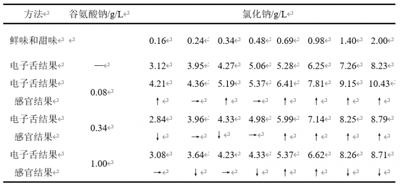 按表稱取一定量的咸味物質(zhì)與不同濃度的鮮味物質(zhì)相互混合配成100mL的溶液,待用。通過電子舌和感官評價(jià)兩種方法對鮮味和咸味的二元相互作用結(jié)果進(jìn)行分析,結(jié)果見表2.7。