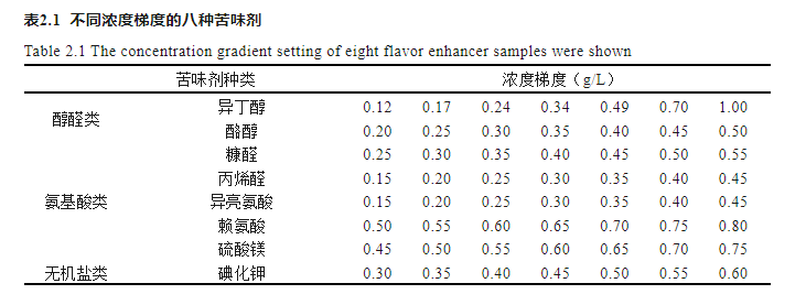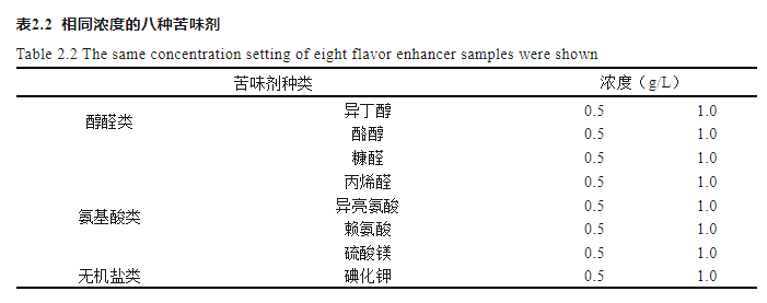 單一苦味物質(zhì)濃度:按表2.1和2.2所列的濃度,準(zhǔn)確稱取不同量的8種苦味物質(zhì),于蒸餾水中攪拌溶解,待全部溶解后,轉(zhuǎn)移至100 mL的容量瓶中,定容,配制成表中所示的濃度,備用。