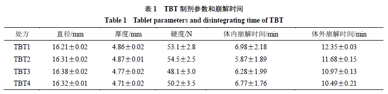 含片硬度、崩解時間的測定 采用游標卡尺測定TBT的厚度和直徑,片劑測試儀測量片劑的硬度。崩解時間的測定選取12名健康志愿者(20~30歲,來自成都中醫(yī)藥大學)評價。將片劑含于口腔內,直到片劑崩解完全,記錄時間,得到其體內崩解時間;將900 mL水加熱維持在(37.0±0.5)℃,作為崩解介質,采用崩解儀測定含片的體外崩解時間。TBT的基本制劑質量參數見表1。掩味后2種含片的外觀直徑略大于原片,厚度變小,可能是由于硬度變小所導致。4種含片的體內崩解時間與體外崩解時間差異較大,可能是由于人體測試過程中會不自主的摩擦攪拌含片,故崩解時間縮短。4種TBT的體外崩解時間均能滿足口含片不在10 min內全部崩解或溶化的要求。