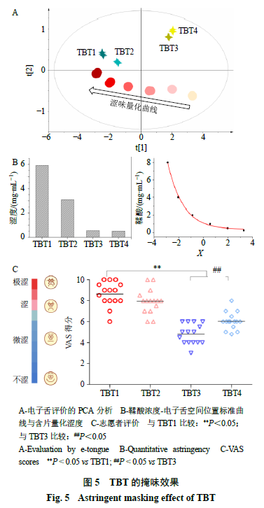 (2)感官分析驗證:采用視覺模擬量表法(visual analogue scale,VAS)進行評估。感官評價小組由來自成都中醫(yī)藥大學的健康志愿者(20~26歲,味覺正常,無抽煙、酗酒史)構成,實驗經過成都中醫(yī)藥大學附屬醫(yī)院倫理委員會(批準編號:2014KL016)審核批準。首先,采用酸(檸檬酸)、苦(奎寧)、甜(蔗糖)、咸(氯化鈉)、鮮(谷氨酸鈉)、澀(鞣酸)6種味覺溶液測試志愿者的味覺靈敏度;再用鞣酸溶液(0.062 5、0.125、0.25、0.5、1、2、4、8 mg/mL)訓練志愿者對澀味強度的認知,熟悉評價標準。最終,15名志愿者(5名男性和10名女性)參加TBT的澀味評估。志愿者將口含片置于口腔內,含服至無顆粒感,根據量表的標尺評分。樣品測試間隔,用純水沖洗口腔至無澀味感,并給予一定時間休息。