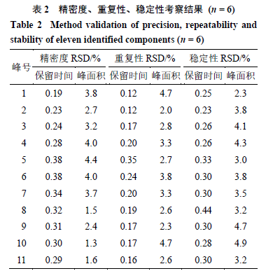 2.5.2 重復(fù)性試驗 按“2.3”項下方法平行制備6批供試品粉末,裝于6個進樣瓶中,每份稱取1.0 g,精密稱定,進樣分析。結(jié)果(表2)表明,11個色譜峰的保留時間和峰面積的RSD最大值分別為0.35%、4.7%,表明方法重復(fù)性較好。