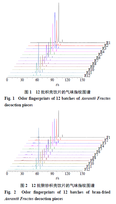 本研究基于Heracles NEO超快速氣相電子鼻技術(shù)結(jié)合Arochembase數(shù)據(jù)庫比對分析,采用氣味指紋圖譜、多變量統(tǒng)計分析方法對枳殼麩炒前后氣味差異標志物進行快速識別,以期從氣味上快速鑒別生、麩炒枳殼飲片,為生、麩炒枳殼飲片的質(zhì)量控制提供參考。