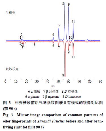 將生枳殼飲片和麩炒枳殼飲片氣味指紋圖譜共有模式(由于色譜峰主要集中在前90 s內(nèi),故選擇前90 s的色譜圖)作鏡像圖,比較兩者色譜峰的數(shù)目及峰面積變化規(guī)律,尋找專屬性差異,可直觀觀察炮制前后的氣味量比關(guān)系變化情況,結(jié)果見圖3。由圖譜可知,在前10~30 s內(nèi),麩炒枳殼相比于生枳殼,色譜峰數(shù)目有增加,例如4、6號峰;在50~70 s內(nèi),麩炒枳殼相比于生枳殼,色譜峰數(shù)目幾乎無變化,但色譜峰的峰高下降明顯,例如8~10號峰;經(jīng)計算發(fā)現(xiàn),12批麩炒枳殼飲片中8號峰(β-月桂烯)峰高平均下降54.5%、9號峰(D-檸檬烯)平均下降42.4%,10號峰(γ-松油烯)平均下降46.1%,表明枳殼經(jīng)麩炒后揮發(fā)性成分含量下降明顯。與文獻“經(jīng)麩炒后,麥麩皮可以吸收部分揮發(fā)油,使揮發(fā)油成分降低”論述相一致[15]。