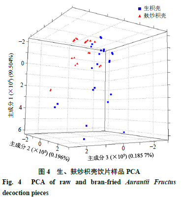 2.6.2 主成分分析(principal component analysis,PCA) PCA是一種無監(jiān)督的模式識別方法,將數(shù)據(jù)降維處理提取幾個特征值較大且能反映樣本信息變量的因子進行線性分類,可在多維空間直觀顯示樣品間的差異,同時也可顯示變量之間的分布[11,16]。將超快速氣相電子鼻所分離色譜峰作為影響因子,進行PCA,結(jié)果見圖4。在PCA模型中,第1主成分(PC1)貢獻率為99.504%,第2主成分(PC2)貢獻率為0.196%,第3主成分(PC3)貢獻率為0.185 7%,主成分累積貢獻率之和達99.885 7%,能較好地對生、麩炒枳殼飲片進行區(qū)分。