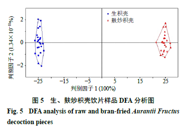 2.6.3 判別因子分析(discriminant factor analysis,DFA) DFA是在主成分分析的基礎(chǔ)上,根據(jù)某些準則建立判別函數(shù),將不同組別樣本的差異擴大,使同類樣本間差異縮小的一種具有判別分類功能的數(shù)據(jù)模型,可以用來識別和分類未知樣本[11,17]。對生、麩炒枳殼樣品的超快速氣相電子鼻數(shù)據(jù)進行判別因子分析,結(jié)果如圖5所示,橫、縱坐標分別表示DFA轉(zhuǎn)換得到的第1區(qū)分指數(shù)(DF1)和第2區(qū)分指數(shù)(DF2)。圖中DF1的區(qū)分指數(shù)為100%,說明DFA分析法能夠更好地從氣味角度區(qū)分生、麩炒枳殼樣品,且二者距離較遠,氣味明顯改變,差異較大,這也符合實際感官描述。表明氣相電子鼻可以快速鑒別生、麩炒枳殼飲片,進一步驗證了PCA的分析結(jié)果。