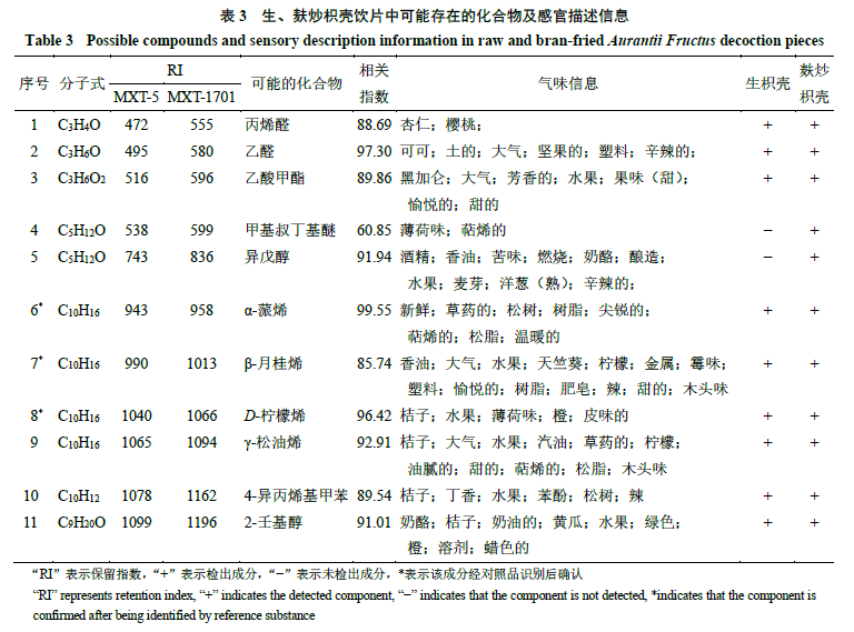 2.6.4 生、麩炒枳殼飲片氣味差異標志物分析 將生、麩炒枳殼飲片在超快速氣相電子鼻色譜柱上采集到的色譜峰與Arochembase數(shù)據(jù)庫進行匹配分析,結(jié)果共鑒定出11個主要氣味化學(xué)成分,其中生枳殼飲片中有9個氣味化學(xué)成分,與麩炒枳殼相比,缺少甲基叔丁基醚、異戊醇2個成分。生、麩炒枳殼中可能存在的化合物及感官描述信息見表3。進一步分析已鑒定出的可能化合物氣味信息發(fā)現(xiàn),β-月桂烯、D-檸檬烯、γ-松油烯、4-異丙烯基甲苯、2-壬基醇具有“桔子、橙、檸檬”的味道,而桔子、橙、檸檬均為蕓香科柑橘屬植物,果皮均含有豐富的揮發(fā)油,β-月桂烯、D-檸檬烯和γ-松油烯為單萜類化合物,是揮發(fā)油的組成成分,具有特殊香氣,且D-檸檬烯主要存在于柑橘類植物中[18];本研究用枳殼飲片來源于蕓香科柑橘屬植物,表明已鑒定出的成分與枳殼含有的成分有較好的一致性。