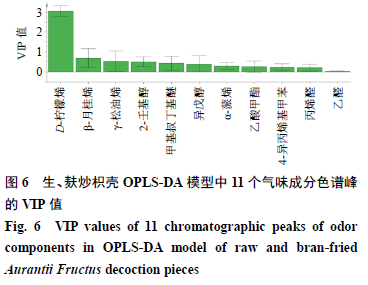 在得到生、麩炒枳殼飲片氣味成分信息的基礎(chǔ)上,為進一步分析得出氣味差異標志物,以11個氣味成分所對應(yīng)的色譜峰峰面積為變量,采用SIMCA 14.1軟件建立生、麩炒枳殼OPLS-DA模型,分析得到11個成分的VIP值,結(jié)果見圖6。VIP值越大,表明該成分對區(qū)分生、麩炒枳殼飲片的貢獻越大。由圖6可知,對區(qū)分生、麩炒枳殼飲片貢獻較大的前3個成分是D-檸檬烯、β-月桂烯和γ-松油烯,且這3個成分也是多數(shù)學(xué)者研究[19-20]有報道的枳殼揮發(fā)油組成成分,結(jié)合枳殼麩炒前后揮發(fā)性成分含量變化情況,初步推測這3個成分為區(qū)分生、麩炒枳殼飲片的氣味差異標志物。