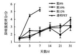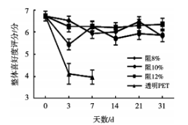 將3種不同質(zhì)量分數(shù)的阻光色油PET瓶灌裝的鮮牛奶和透明PET瓶罐裝的鮮牛奶進行0~31d感官品評,品評時間點分別為0,3,7,14,21和31d,結果如圖1~圖4所示。在31d內(nèi)各樣品的整體喜好度均呈下降趨勢,其中透明PET瓶明顯不受喜歡,在3d時整體喜好度平均值<5(透明PET各指標只測試到7d),與3個阻光色油PET瓶裝樣品相比存在顯著性差異,3個不同質(zhì)量分數(shù)的阻光色油PET樣品的整體喜好度平均值相比均無顯著性差異,整體下降趨勢不明顯,均優(yōu)于透明PET瓶樣品。