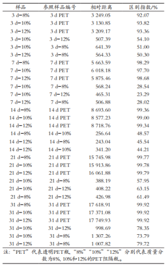 從表2獲知,在相同時間點內(nèi),透明PET樣品與3個不同質(zhì)量分數(shù)阻光色油樣品的區(qū)別指數(shù)均較大,即從初始測試時間3d起,透明PET瓶就與阻光色油PET樣品的相對距離較大,區(qū)別指數(shù)均在92%以上,而且隨著光照時間的增加,透明PET瓶與阻光色油PET瓶相對距離不斷增大,進一步表明,透明PET樣品與3個阻光色油PET樣品差異最大。反觀3個阻光色油PET樣品之間互相比較的區(qū)別指數(shù)、相對距離相似無明顯差別,兩兩之間無明顯相近的樣品,這與感官測評結果一致,阻光PET瓶的樣品更穩(wěn)定。