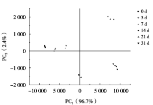 透明PET樣品與3個不同質(zhì)量分數(shù)的阻光色油PET樣品間風味差異大,為進一步分析透明PET瓶樣品不同時間點的風味變化,將透明PET樣品進行單獨的PCA分析,圖5為透明PET樣品6個時間點的PCA分類結果,其中PC1和PC2總貢獻率達到99.1%,能夠有效區(qū)分不同時間點的樣本風味,從圖中看樣品間存在明顯差異,其中0,3和7d相對氣味距離均較近,差異較小,與14,21和31d相對氣味距離較遠,差異較大。