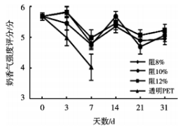 在感官強度指標分析中,透明PET瓶各感官指標變化最為顯著,隨光照時間的增加,奶香氣強度顯著減弱,異味、氧化味強度顯著增強,而有避光措施的阻光色油8%,10%和12%PET瓶樣品整體喜好度、奶香氣強度呈略下降趨勢,異味、氧化味強度稍呈上升趨勢,三者相比無顯著性變化,添加了阻光色油的PET樣品明顯比無避光的透明PET瓶對鮮牛奶的品質(zhì)更具保護力。