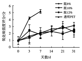 將滅菌后的鮮牛奶分別灌裝至4種PET阻隔瓶,而后將4種樣品置于光照強度3500-4000Lux,4-6℃儲存條件,分別在0,3,7,14,21和31d取樣進行電子鼻檢測和感官品評。