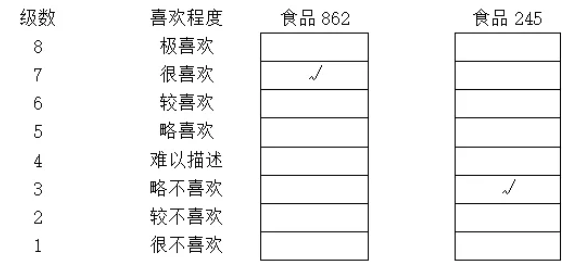 (1)由左至右鑒定兩個食品,進(jìn)行綜合評定,對于更喜歡的食品,將符號“√ ”填入方框中。必須有一個選擇。例如:
