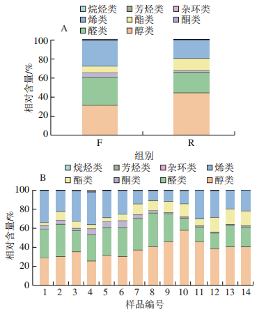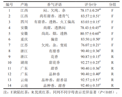 依據(jù)專家感官審評結(jié)果(表1)將14個茶樣分成兩類:優(yōu)質(zhì)紅茶組,用R表示(7個);缺陷紅茶組,用F表示(7個)。優(yōu)質(zhì)紅茶組香氣特征主要呈現(xiàn)甜香、甜花香等,從香氣評分來看,優(yōu)質(zhì)紅茶香氣評分均高于90分。缺陷紅茶組香氣主要表現(xiàn)為熟悶、不純、駁雜、青草氣強(qiáng)、火工偏高等,其評語中以“偏、透、欠”等傾向性強(qiáng)的副詞修飾較多,從香氣評分來看缺陷紅茶評分則低于85分,。綜上分析可知,兩類紅茶香氣品質(zhì)存在明顯差異性。