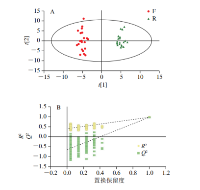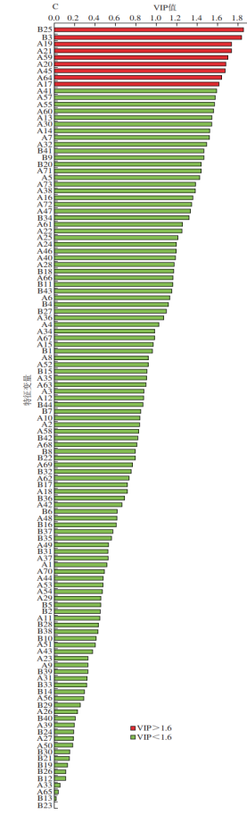 為了進(jìn)一步考察兩組紅茶的分類情況,進(jìn)行OPLS-DA。相較于PLS-DA,OPLS-DA添加了正交計(jì)算以消除與分類無關(guān)的信息,能有監(jiān)督地實(shí)現(xiàn)不同分組間樣品的有效分離?;贕C-E-Nose檢測的揮發(fā)性成分響應(yīng)峰面積數(shù)據(jù)集構(gòu)建OPLS-DA模型,其得分圖如圖1A所示,缺陷紅茶位于第2象限和第3象限,優(yōu)質(zhì)紅茶位于第1象限和第4象限,兩者分離趨勢明顯,模型R2Y=0.973,Q2=0.925,表明該模型具有較好的解釋能力和預(yù)測能力。置換檢驗(yàn)(n=200)中R2和Q2的截距分別為0.426和-0.865,Q2截距<0,說明該模型不存在過擬合(圖1B)。結(jié)果表明,GC-E-Nose結(jié)合多元統(tǒng)計(jì)分析可實(shí)現(xiàn)缺陷紅茶與優(yōu)質(zhì)紅茶快速區(qū)分。