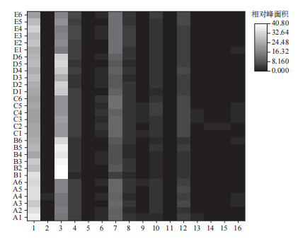 通過電子鼻對不同地區(qū)生乳進行檢測,生乳氣味指紋圖譜,如圖1所示。對各地區(qū)指紋圖譜進行對比分析后,發(fā)現(xiàn)生乳氣味指紋圖譜中共檢出16個共有峰,不同地區(qū)生乳樣品峰的數(shù)量幾乎沒有差異,,結(jié)合16個特征峰相對峰面積熱圖(圖2)分析,不同地區(qū)生乳特征峰基本相同,但特征峰含量有明顯區(qū)別。