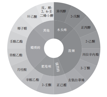圖3 生乳氣味特征成分(外圈)和主觀感知類別(內(nèi)圈)的氣味輪