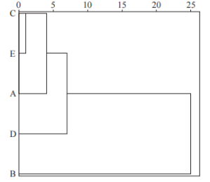 為初步判定峰面積較大的異丙醇、2-丁酮和環(huán)己酮含量對生乳地區(qū)歸屬的影響,以生乳中檢測的相關(guān)含量為變量,歐式距離平方為度量標(biāo)準(zhǔn),通過組間平均數(shù)聯(lián)結(jié)法完成聚類分析,結(jié)果如圖5所示。其中,和林格爾生乳樣品(C)與寧夏生乳樣品(E)先聚為一類,此類生乳異丙醇、2-丁酮和環(huán)己酮含量相對偏低,再與巴彥淖爾生乳樣品(A)聚為一類后與涼城生乳樣品(D)聚為一類,最后與達拉特旗生乳樣品(B)聚類,達拉特旗生乳樣品的各物質(zhì)含量較高。