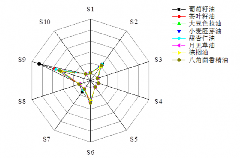 摻入植物油后的摻假八角精油樣品在色澤方面無(wú)顯著差異。下圖為純八角精油和摻假八角精油的雷達(dá)指紋圖譜,從圖中可以看出植物油摻假的八角精油和純八角精油之間的差異主要體現(xiàn)在S9號(hào)傳感器和S7號(hào)傳感器上,表明八角精油摻入植物油主要改變了其芳香類(lèi)氣味,使其氣味體系發(fā)生了較大的變化。