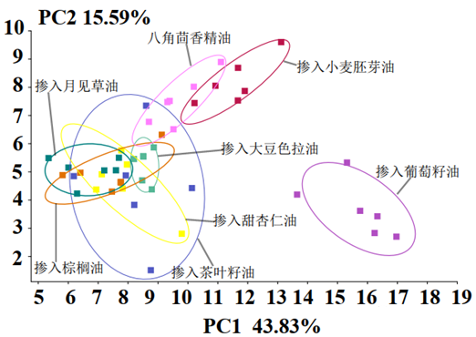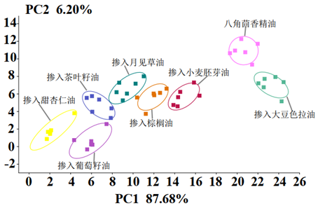 可見(jiàn),應(yīng)用電子鼻結(jié)合PCA分析對(duì)摻入不同植物油的八角精油進(jìn)行鑒定,能夠很好地區(qū)分鑒別摻入不同的植物油(葡萄籽油、茶葉籽油、大豆色拉油、小麥胚芽油、甜杏仁油、月見(jiàn)草油和棕櫚油)。