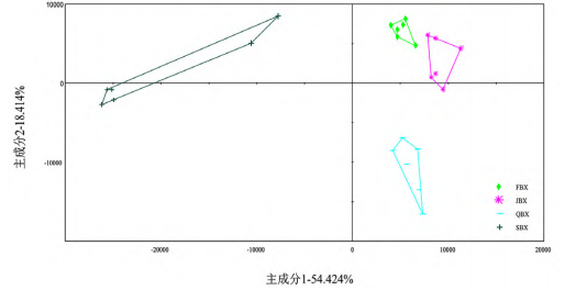 根據(jù)HeraclesⅡ超快速氣相電子鼻得到半夏及其炮制品的色譜圖,以其色譜圖峰面積為變量進(jìn)行PCA分析,結(jié)果如圖3所示。判別指數(shù)為70,主成分(PC1=54.424%,PC2=18.414%)的累計(jì)貢獻(xiàn)率為72.838%,表明所建立的模型能夠較好地反映樣品的氣味信息。四種炮制品能夠被良好地區(qū)分:半夏主要分布在第二、三象限,且樣品分布較為分散,說明樣品之間氣味差異較大;姜半夏、法半夏、清半夏主要分布在第一、四象限,與半夏分布距離較遠(yuǎn),且這三種炮制品之間也能較好地區(qū)分。以上結(jié)果表明半夏的不同炮制品之間存在氣味差異,PCA模型可以用于區(qū)分半夏及其炮制品。